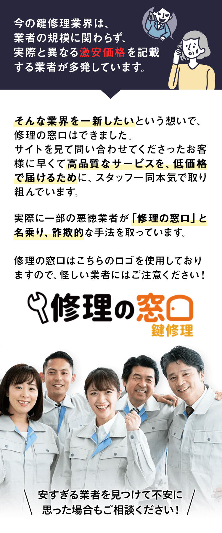 仲介業者を挟まず、受付から作業完了まで一貫して自社で対応しているので、仲介手数料がゼロ!